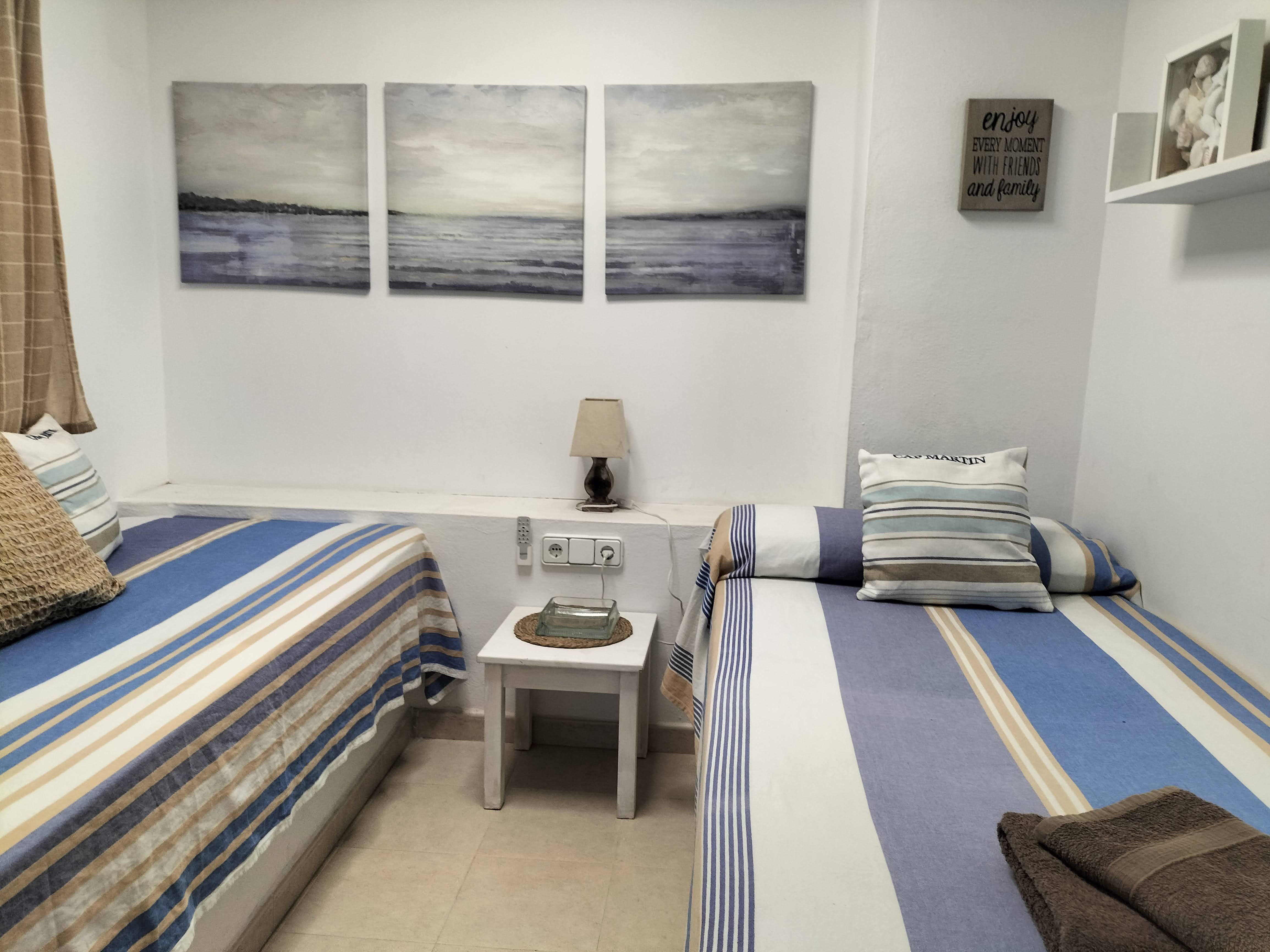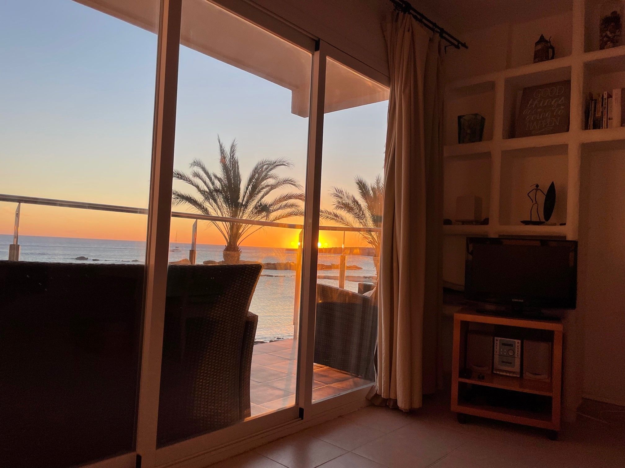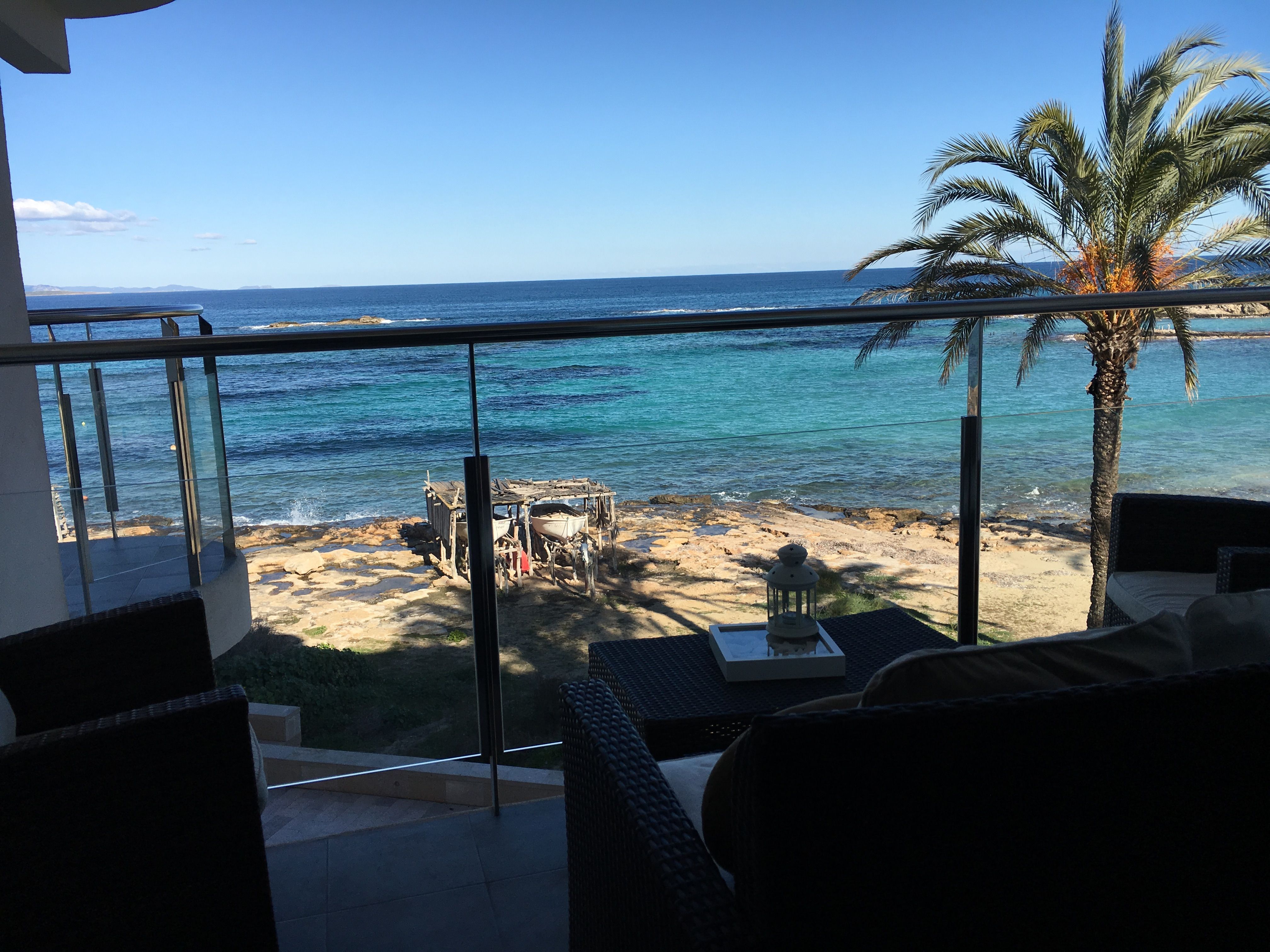 Apartamento en primera línea de mar, en el paseo marítimo de Es Pujols. Vistas a la playa y toda la bahía; de noche, al mercadillo. Zona muy animada, con bares, restaurantes, cafeterías y comercios alrededor. Aire acondicionado y televisión.