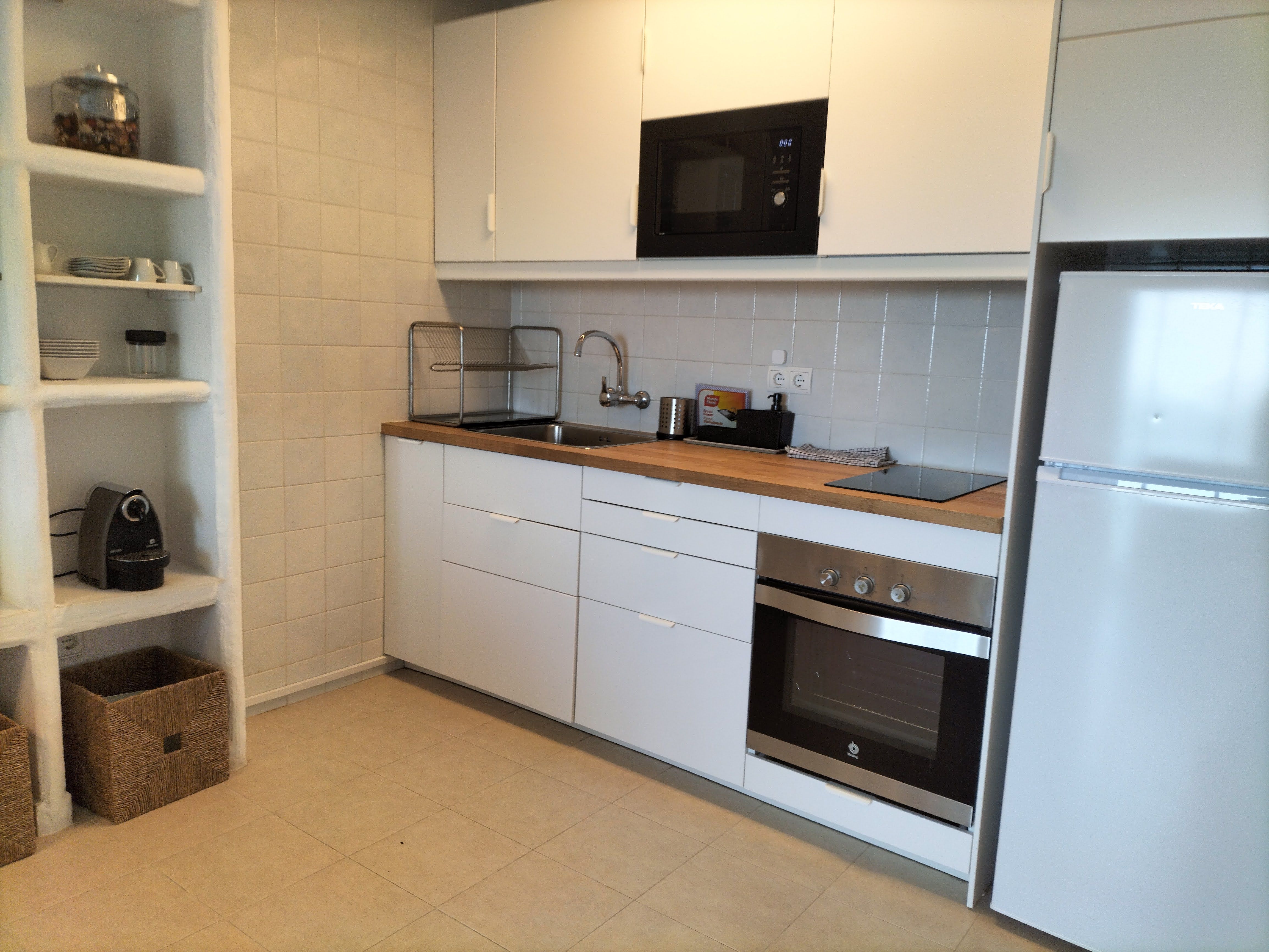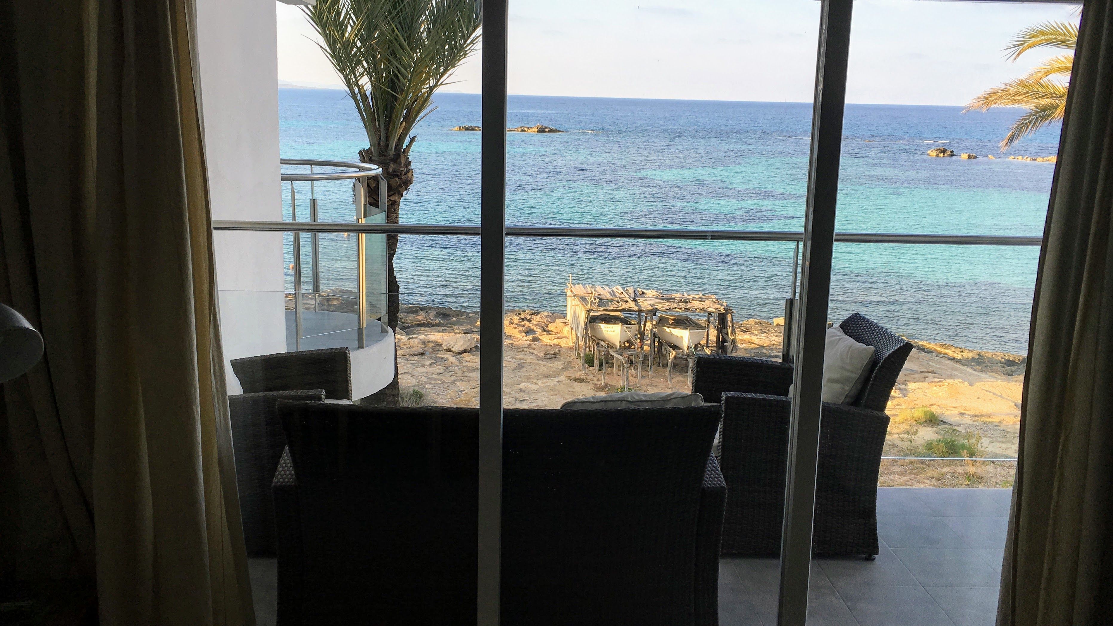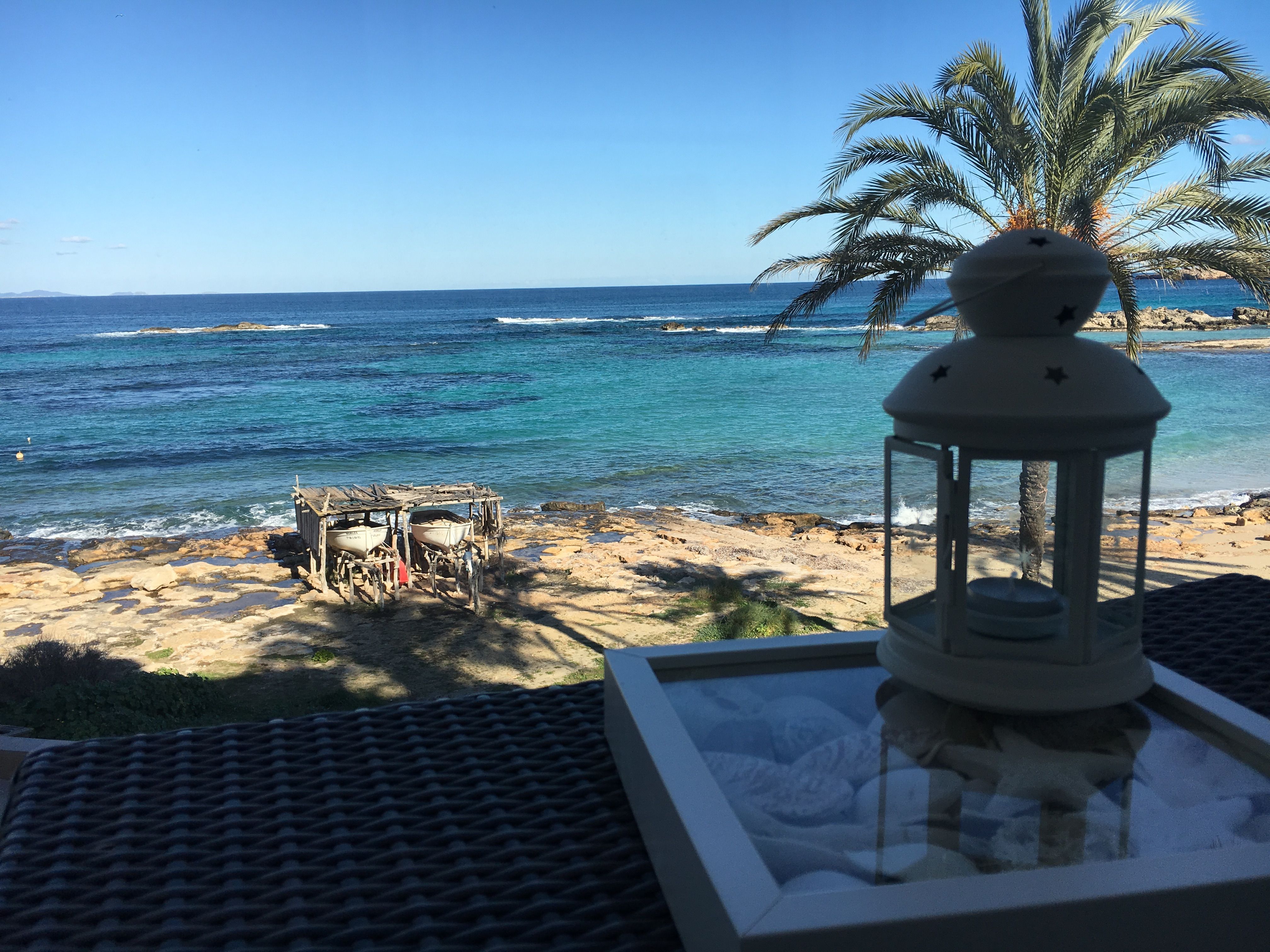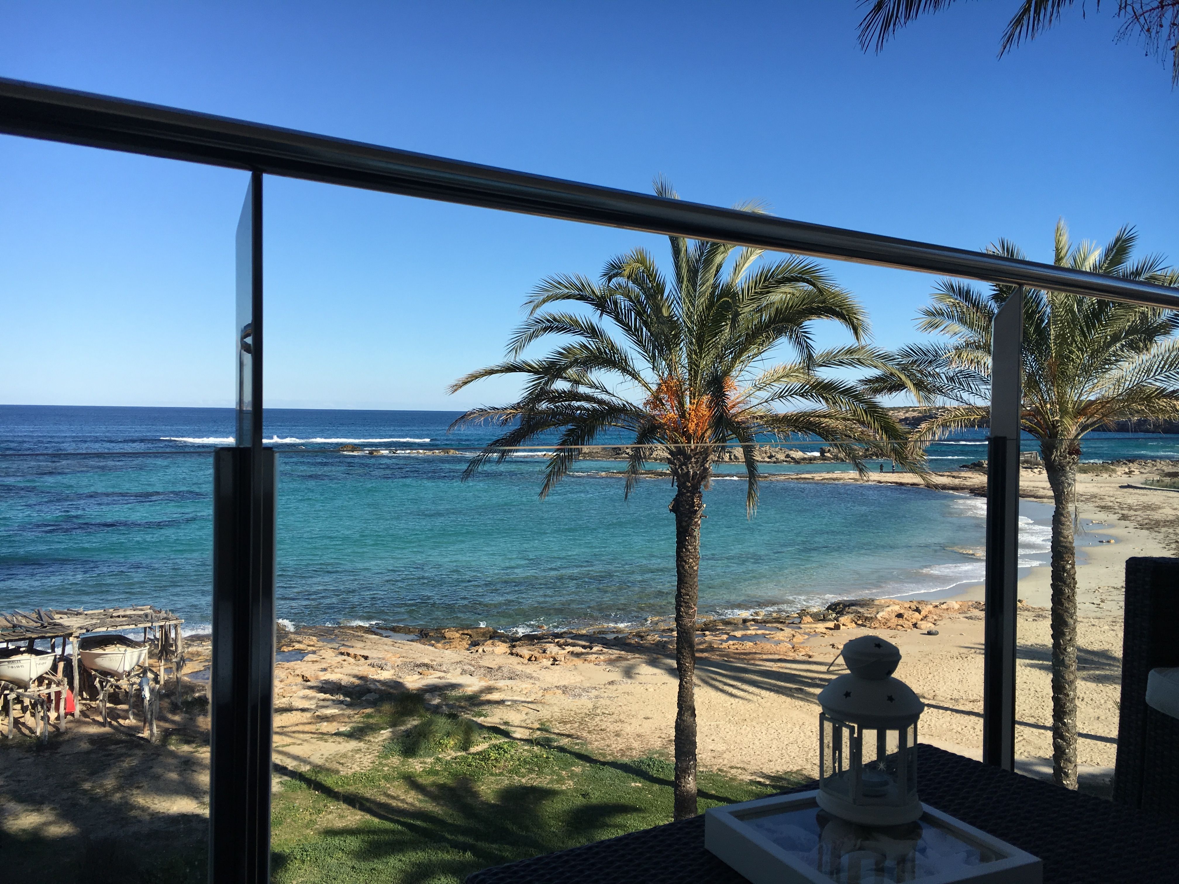 Apartamento en primera línea de mar, en el paseo marítimo de Es Pujols. Vistas a la playa y toda la bahía; de noche, al mercadillo. Zona muy animada, con bares, restaurantes, cafeterías y comercios alrededor. Aire acondicionado y televisión.