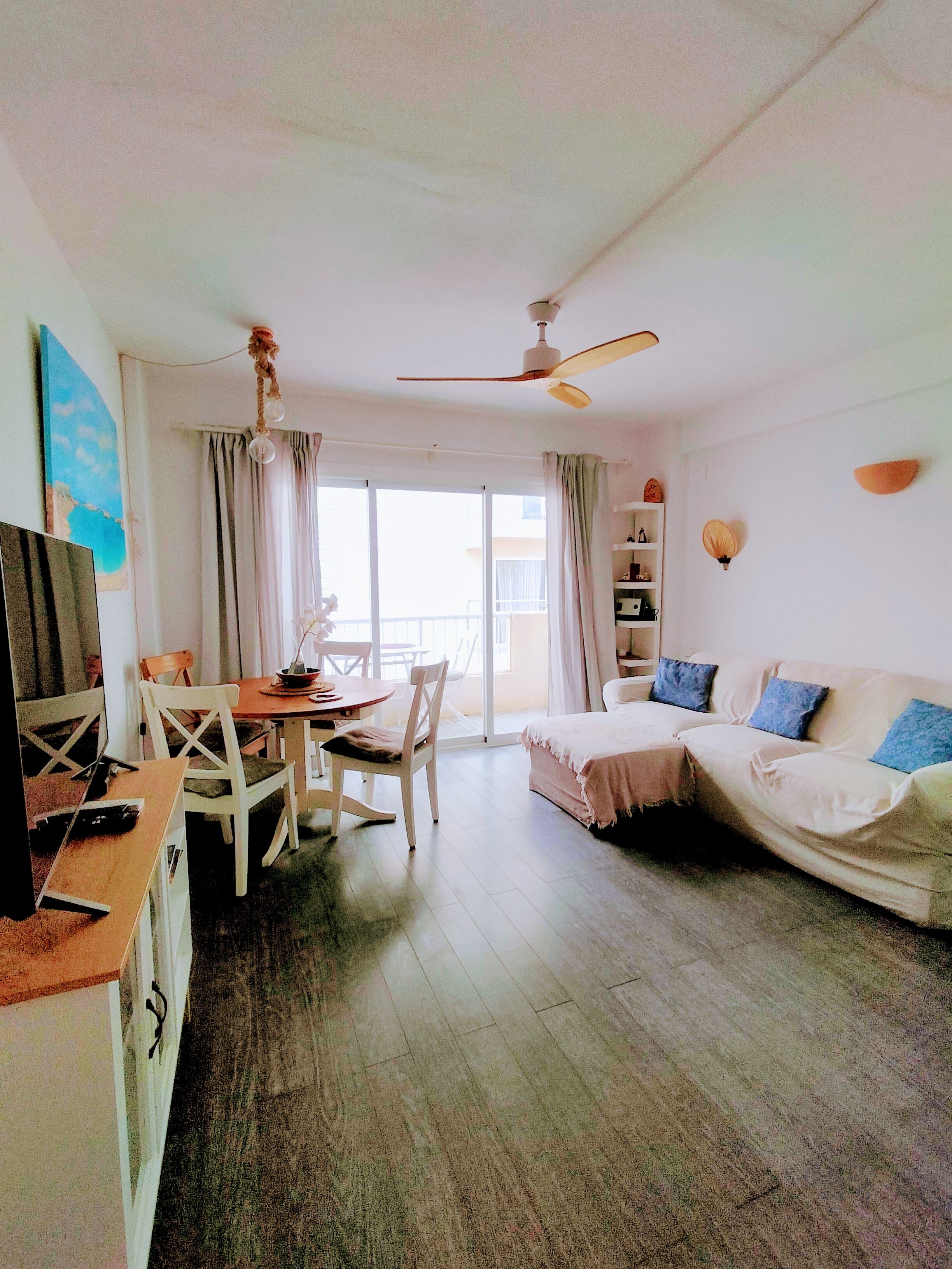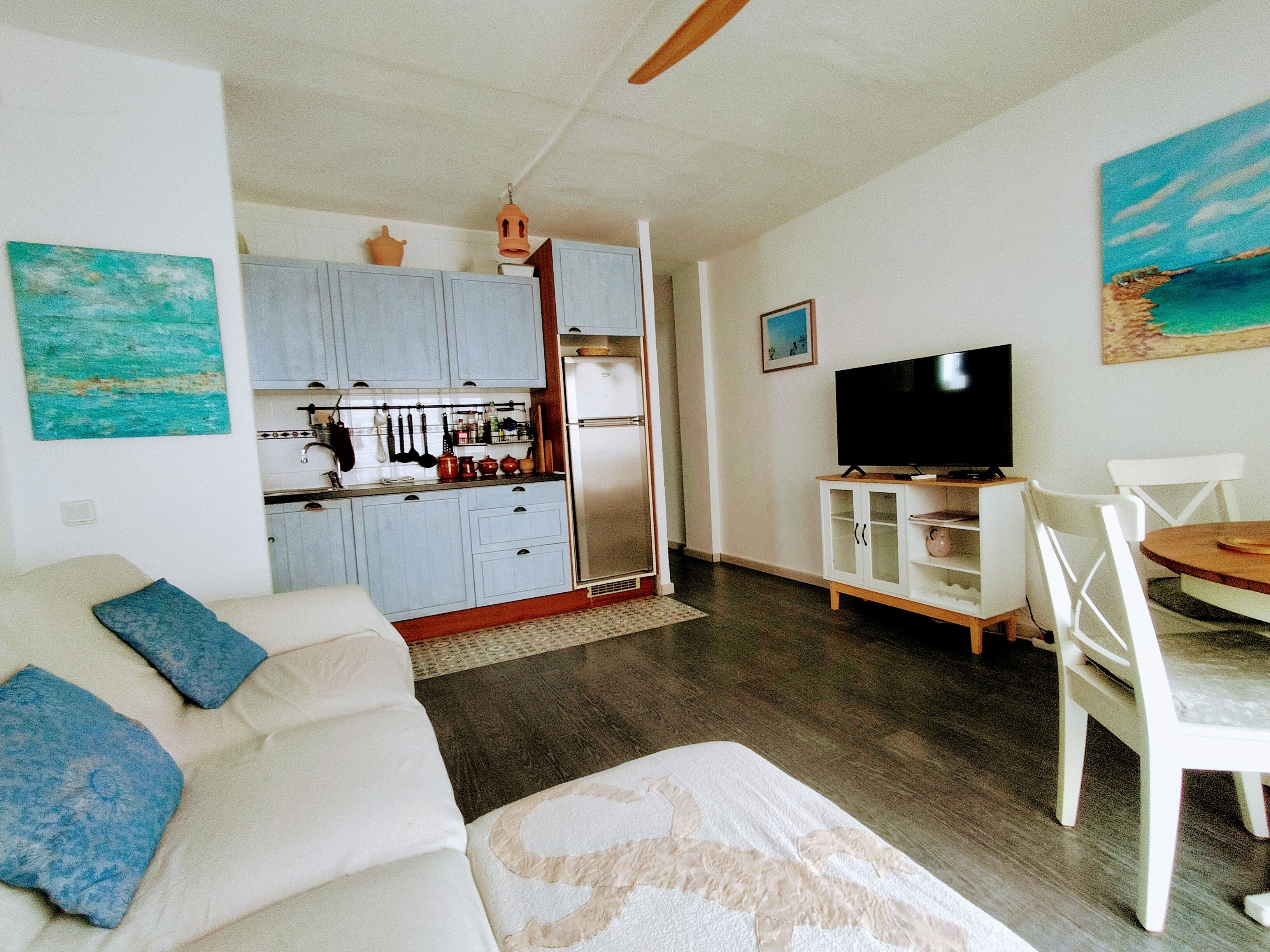 Apartamento de dos habitaciones en el centro de Es Pujols, a pocos metros de la playa. Con todos los servicios en proximidad: restaurantes, cafeterías, tiendas.